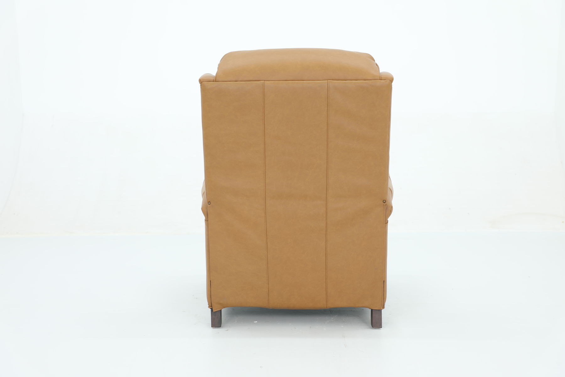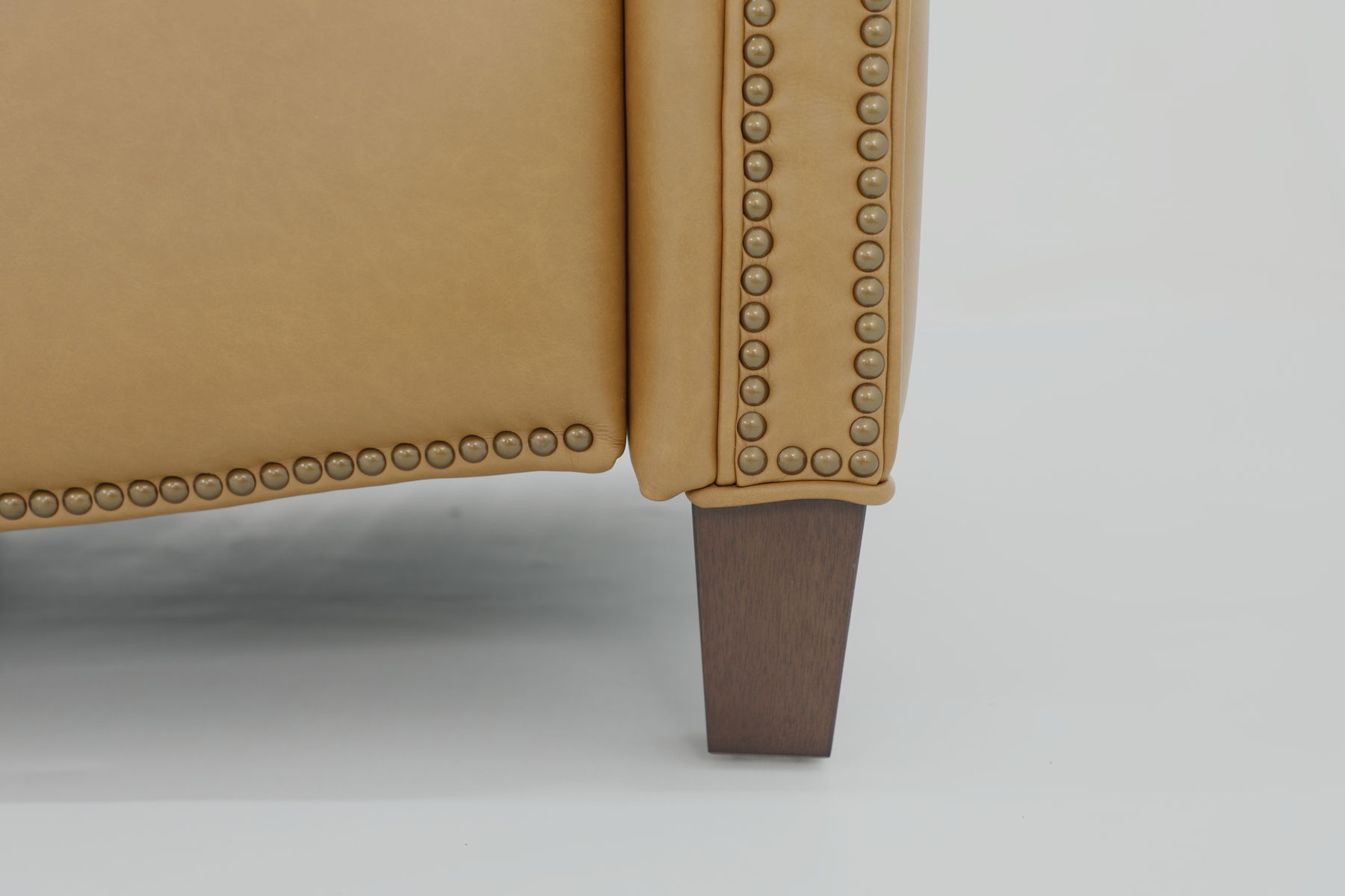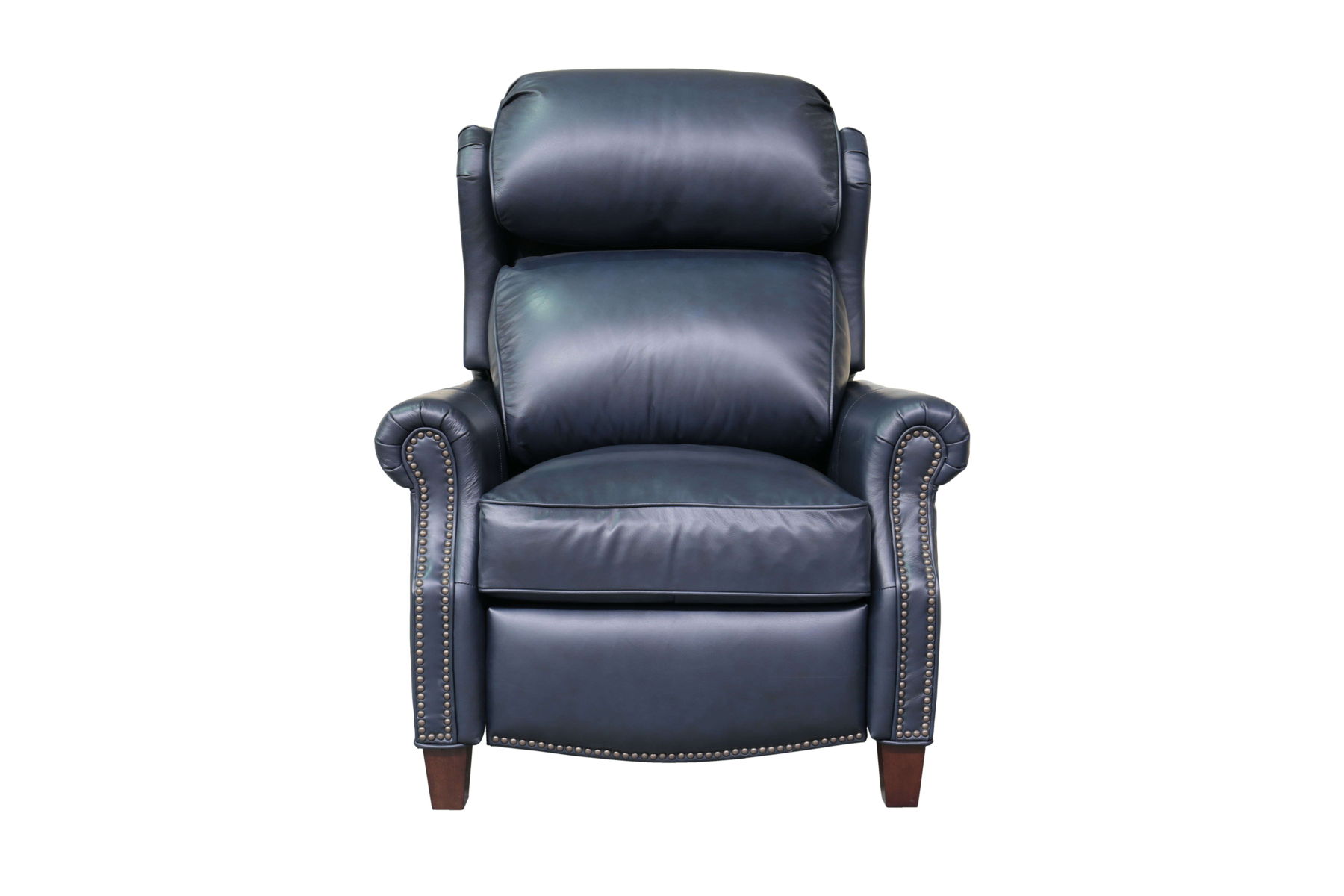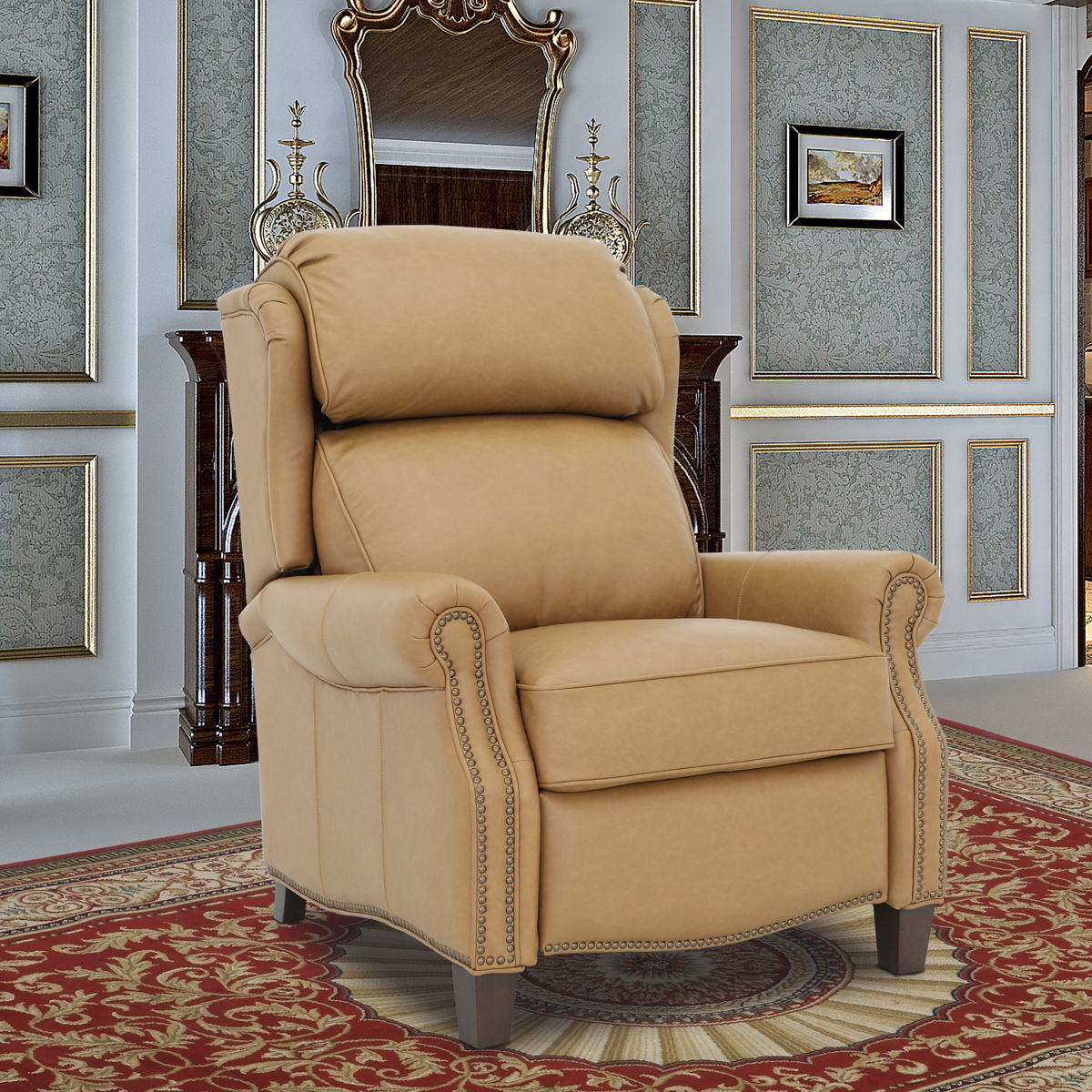 Classic smaller scale wing back lounge chair recliner. 3-way push thru the arms mechanism with footrest extension. Kneed back rolled arms with nail head trim. Adjustable semi attached pub back, boxed loose seat cushion with pocketed coils and down blend feather wrap. Shaped lower side rails and footrest. Tapered wood legs.