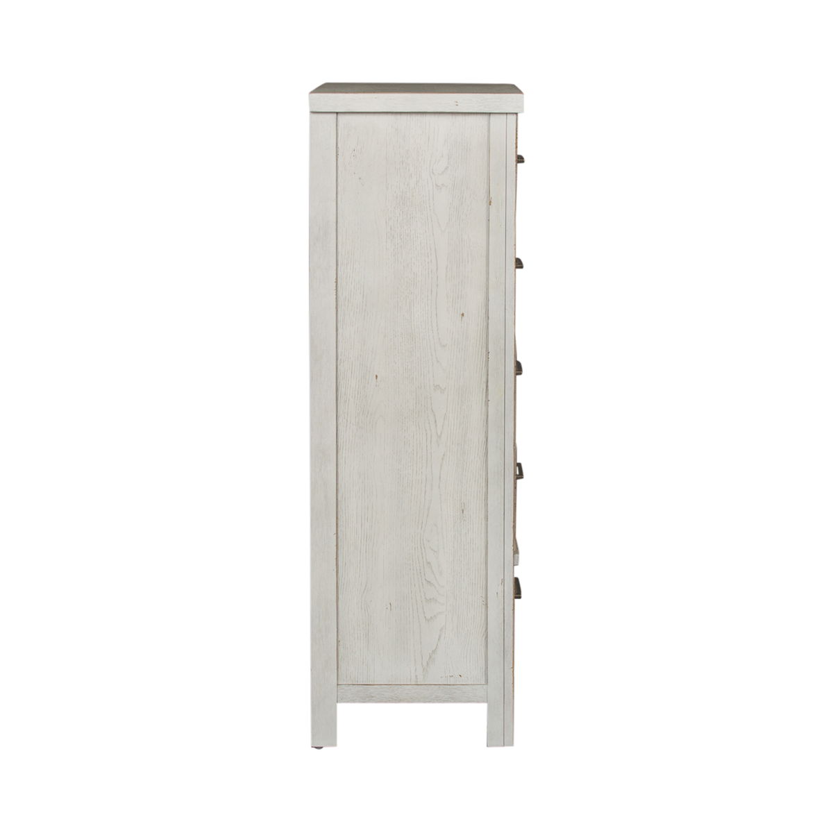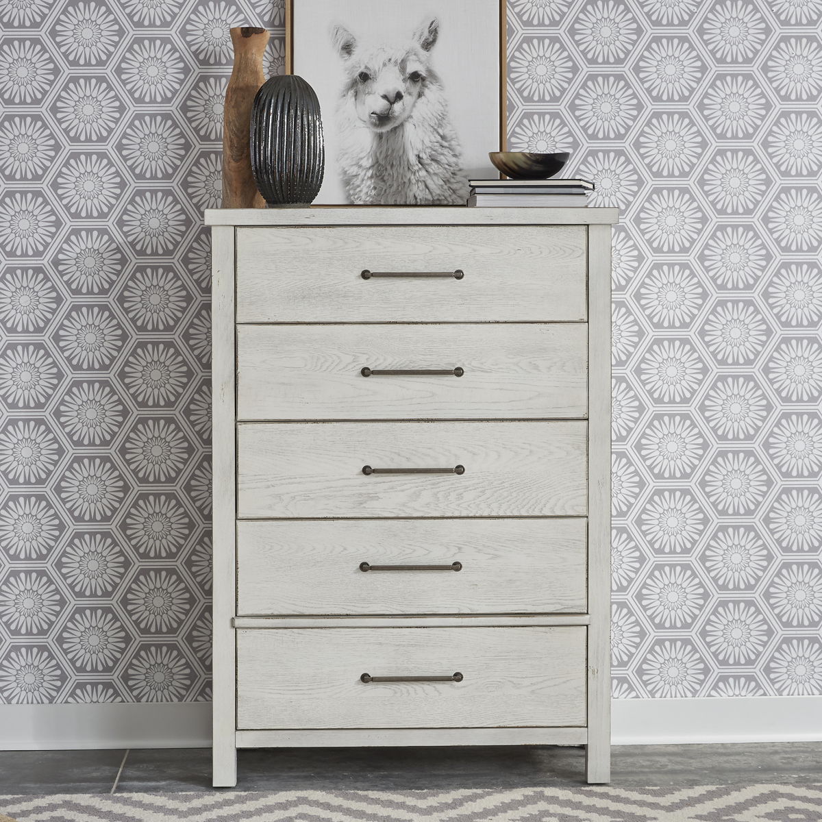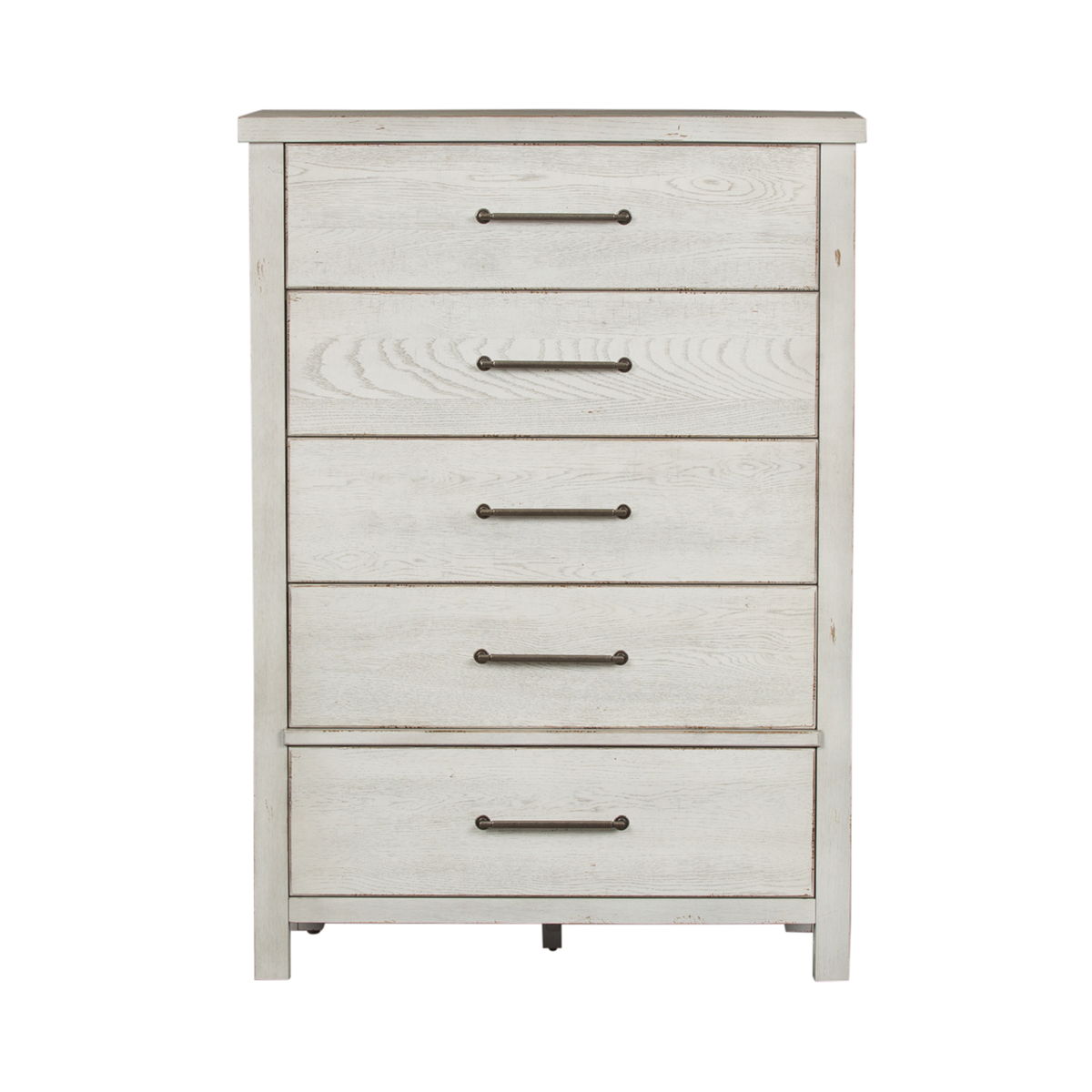 Create an inviting space with the Modern Farmhouse chest. Crafted with poplar solids and knotty white oak veneers, this piece features bottom case dust proofing, cedar lined bottom drawers, fully stained interior drawers and premium felt lined top drawers. The dusty charcoal finish with heavy distressing accompanied by washed brass elongated bar pull hardware offers a neutral palette finish and adds texture to any space.