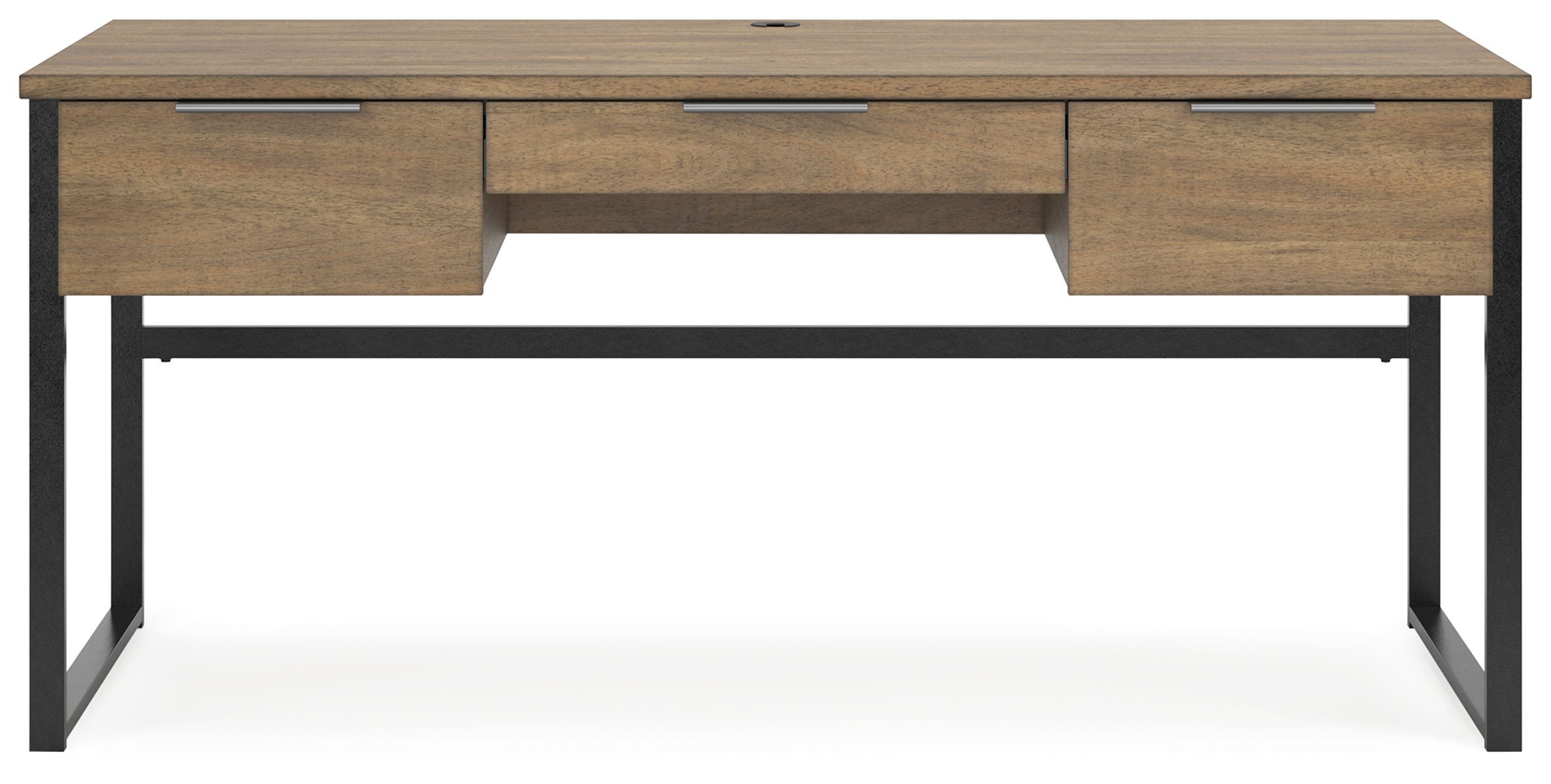Urban Contemporary design. Made with Mango wood veneer, MDF substrate and metal frames. Finished in a light brown wood tone with contrasting gunmetal gray frames. Desk features 3 drawers and open raceway on the back side to help keep wires and power supplies neatly tucked out of sight. Matching bookcase with five 58″ wide gallery shelves.
