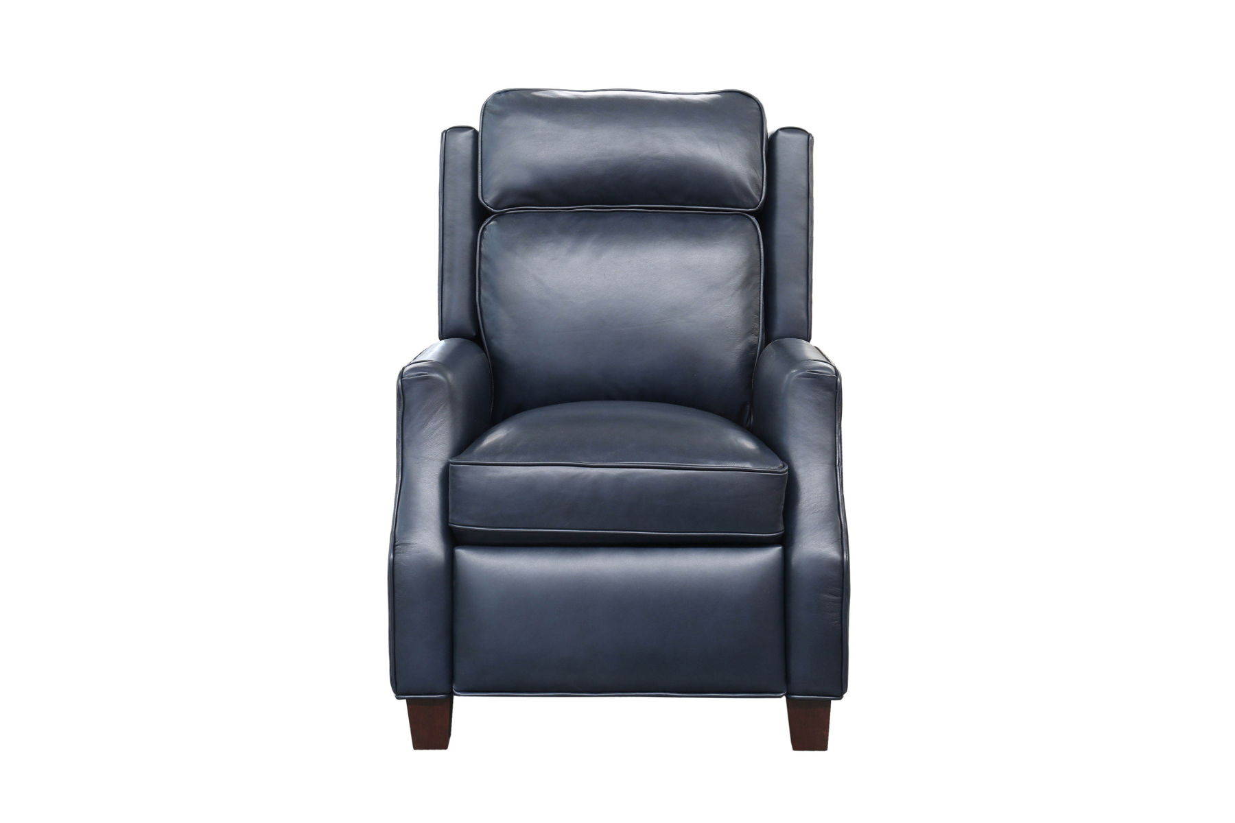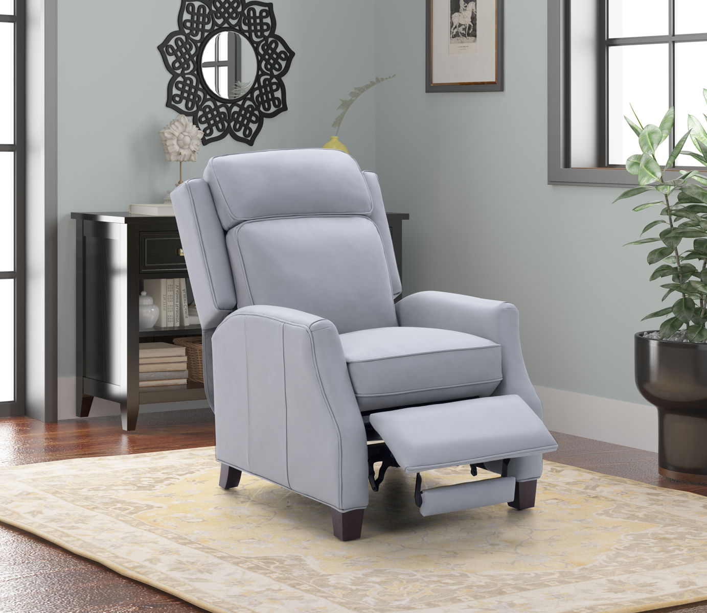 High Pub Back Push Thru The Arms 3 Way Recliner With Articulated Head Rest Area For Additional Support And Footrest Extension For Complete Body Comfort. Welt Detail On The Wings, Arms, Back And Seat. Tight Boxed Seat Has Pocket Coils. Mahogany Finished Hand Carved Tapered Wood Legs Complete This Very Comfortable And Sophisticated Look.