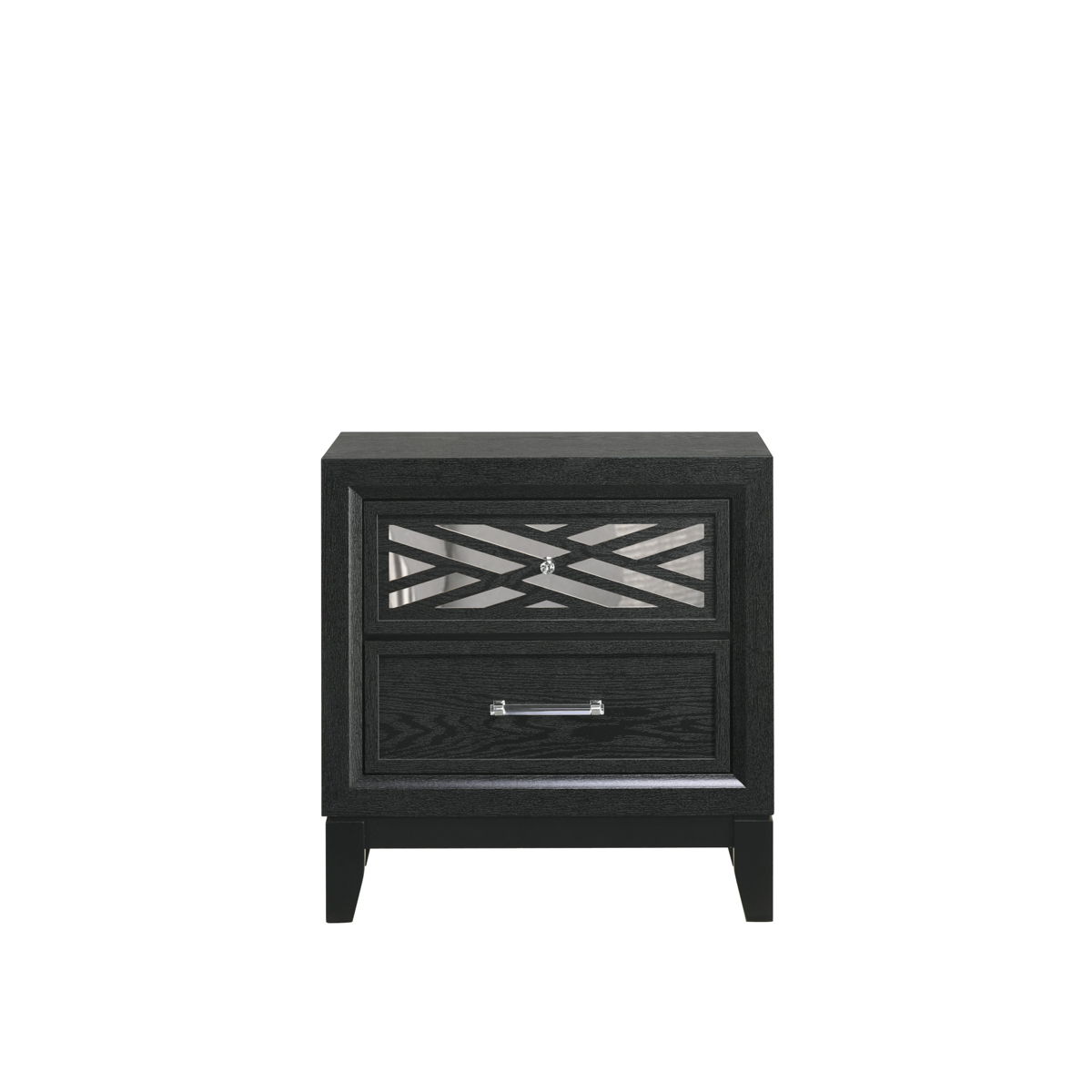 The Obsidian 2-Drawer Nightstand in Black is a striking blend of modern elegance and practical design, perfect for complementing any bedroom decor. Crafted with meticulous attention to detail, this nightstand is made from premium solid Rubberwood, enhanced with manufactured woods and veneers, ensuring both lasting beauty and the durability of genuine wood. Its sleek design is highlighted by clean lines and a chic, low-sheen black finish that exudes bold sophistication. The geometric cut-outs, backed with mirror-like Mylar, introduce a touch of luxury and modern glamour, making this piece both functional and visually appealing. The nightstand features two smooth-gliding drawers, equipped with durable Kenlin Glides and stylish acrylic drawer pulls. Each drawer is expertly crafted with quality dovetail joinery and finished interiors, providing a snag-free, elegant storage solution for your bedside essentials. This nightstand is the perfect combination of fashion and function, adding a touch of refined style to your bedroom.