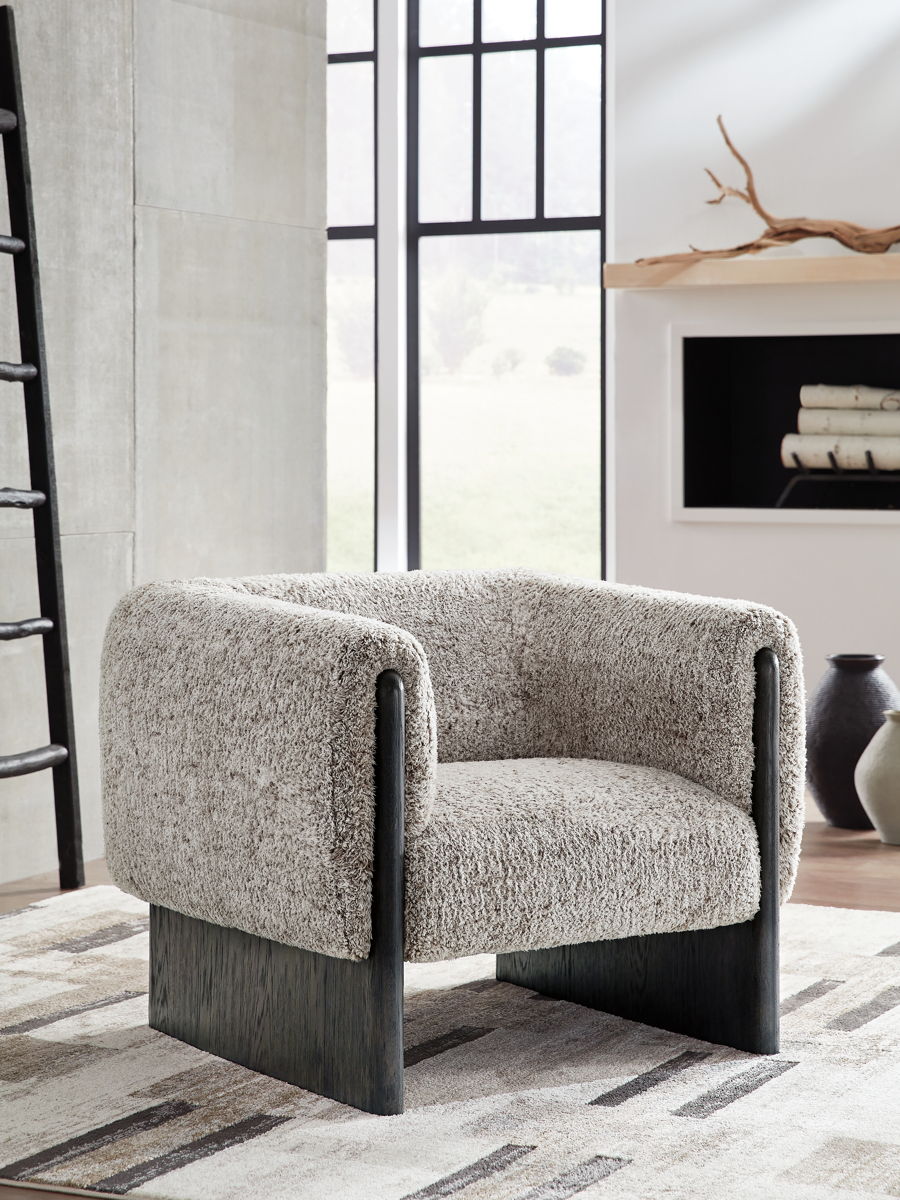 Decidedly contemporary in form, this accent chair is a statement-making addition to your home. Its cozy, ultra-soft faux shearling fabric creates a richly tactile lounging experience. Arms with espresso brown oak veneer extend to the base, lending an architectural appeal to the overall look.
