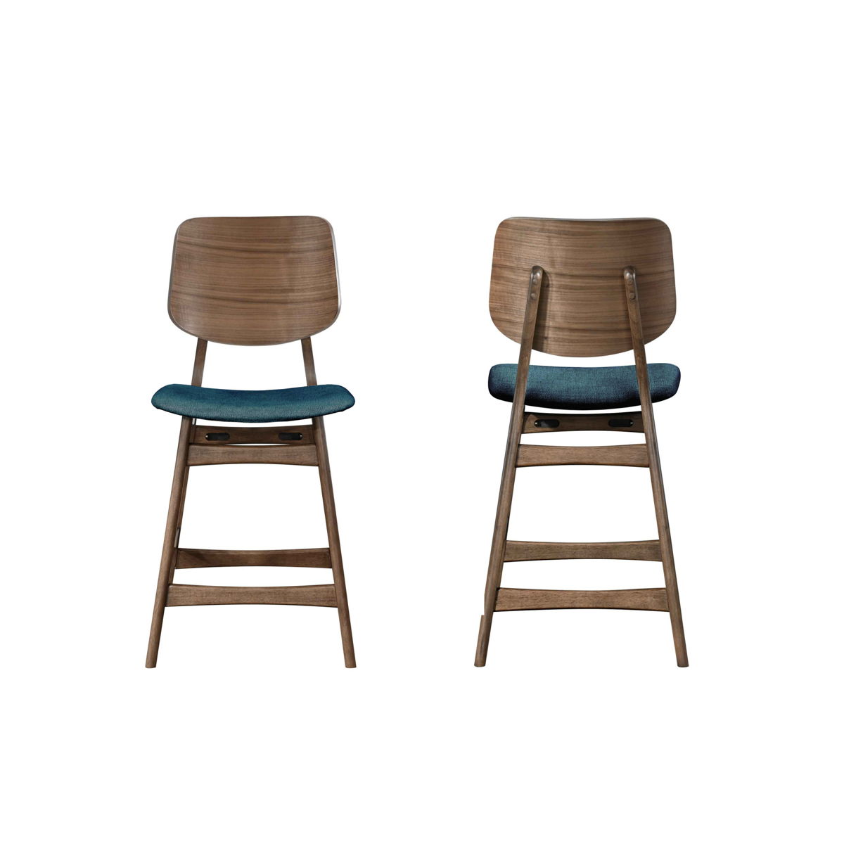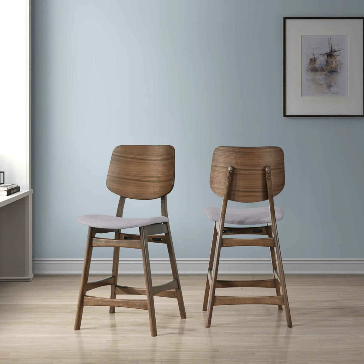The Oscar Mid-Century Modern Counter Height Dining Chairs (Set of Two) offer a perfect blend of style and practicality for your dining space. Crafted from solid Rubberwood and Walnut veneers, these counter height chairs are built to last, with reinforcing base stretchers providing added stability and durability. The clean, clear finish highlights the natural beauty and grain patterns of the Walnut, adding a touch of sophistication to your home. Emphasizing clean lines, organic curves, and functional design, the Oscar Dining Collection captures the essence of mid-century modern style. These counter height chairs not only enhance your decor but also ensure comfort with foam seat cushions wrapped in 100% polyester fabric. Ideal for any counter height dining table, these chairs balance form and function, creating an inviting and practical living space. The Oscar Mid-Century Modern Counter Height Dining Chairs are a stylish and durable addition to any contemporary home, offering both aesthetic appeal and comfort.