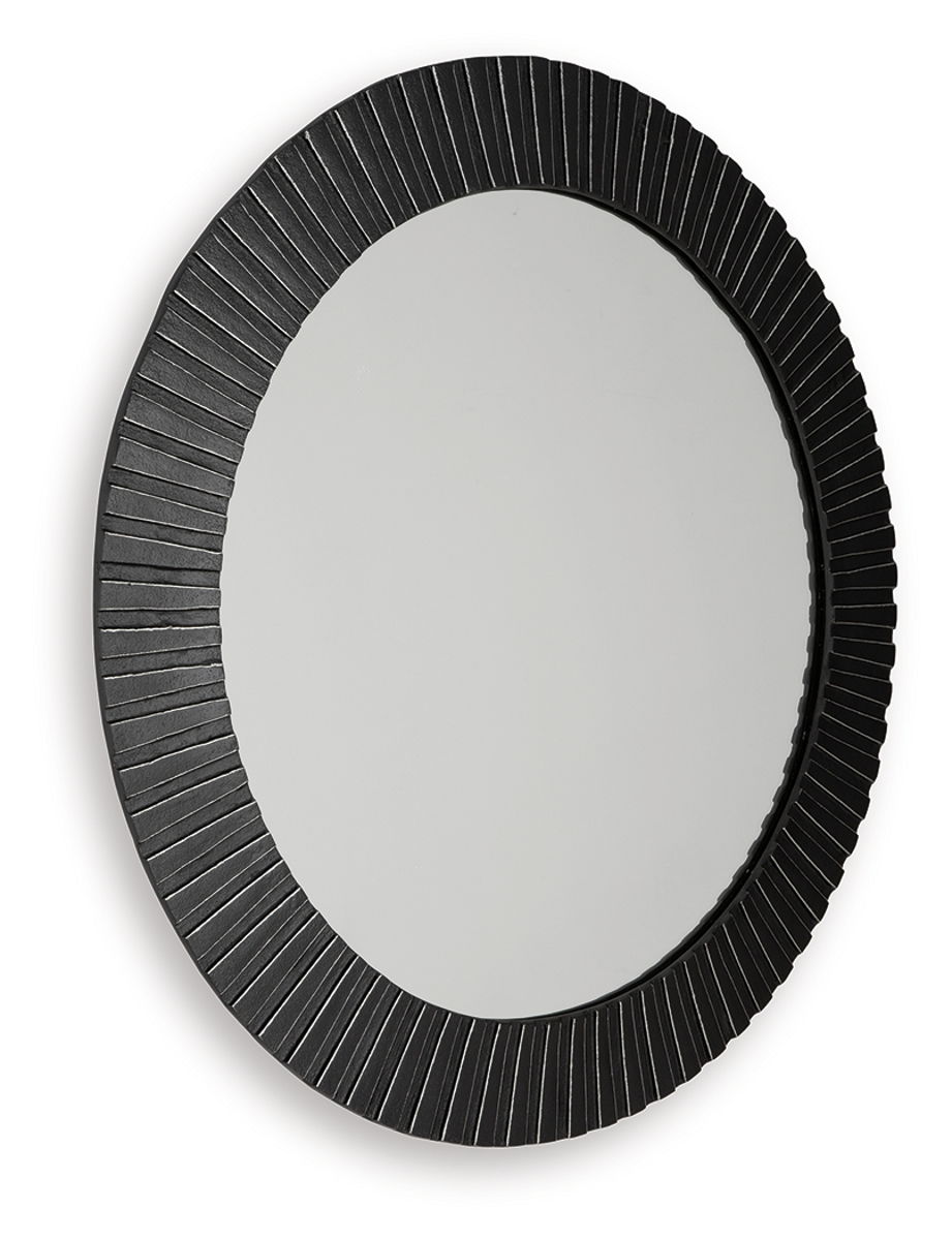 With its striking ribbed design and a contrasting black and antiqued silver finish, this accent mirror expresses modern sophistication in your space. The cast aluminum frame offers a sturdy and substantial feel, making it a lasting addition to your home. It’s simple yet elegant, reflecting both light and good taste.
