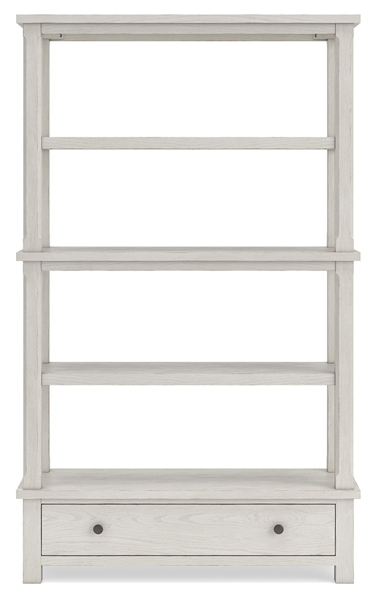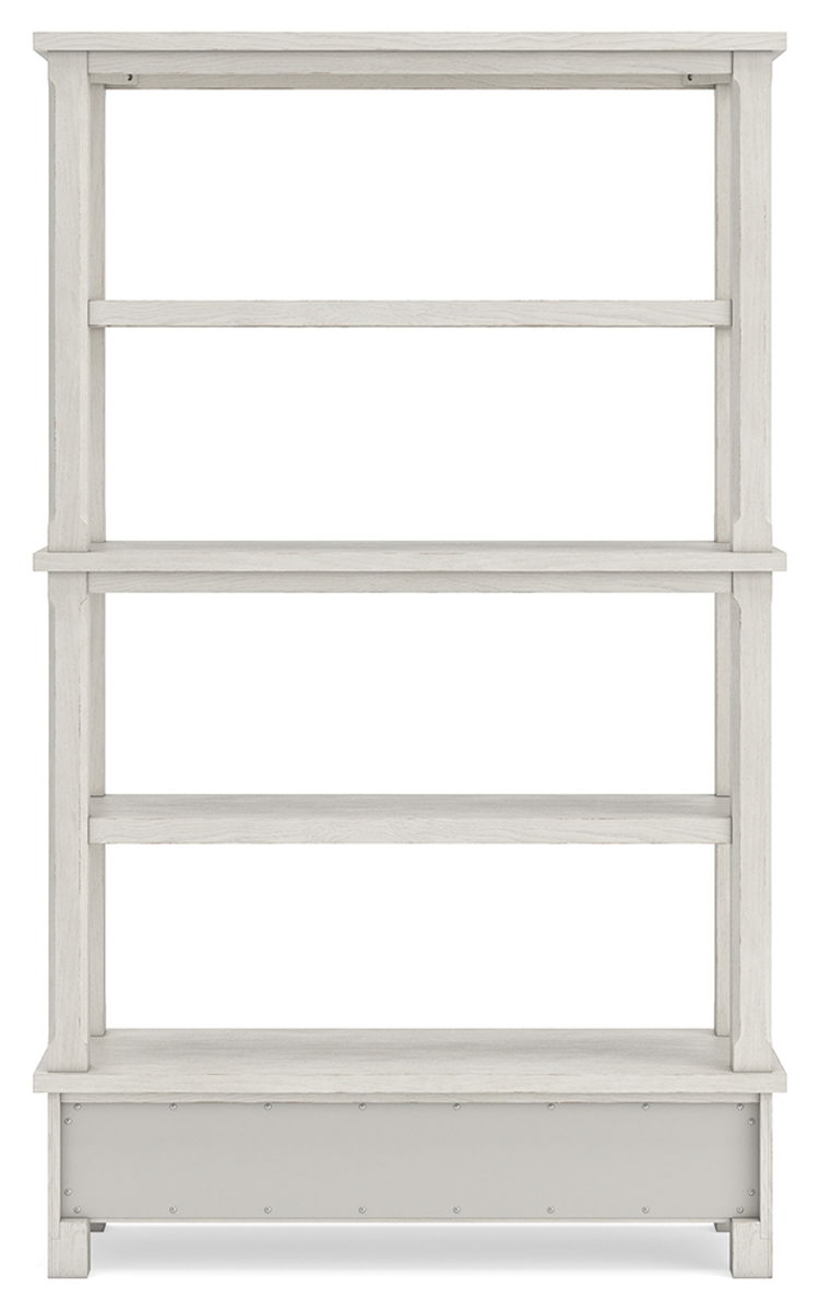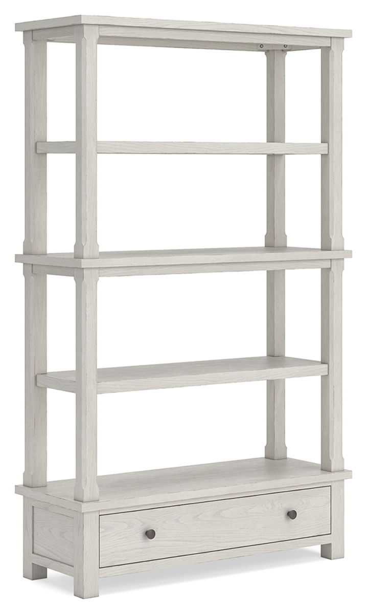 This bookcase is sure to impress when it’s time to study or work from home. With its antiqued white finish and wood grain texture, modern farmhouse-style workstations have never been so fashionable. The open four-shelf design is ideal for storage and displaying your treasures. And that large storage drawer brings even more function to your workspace. All that’s missing is you.