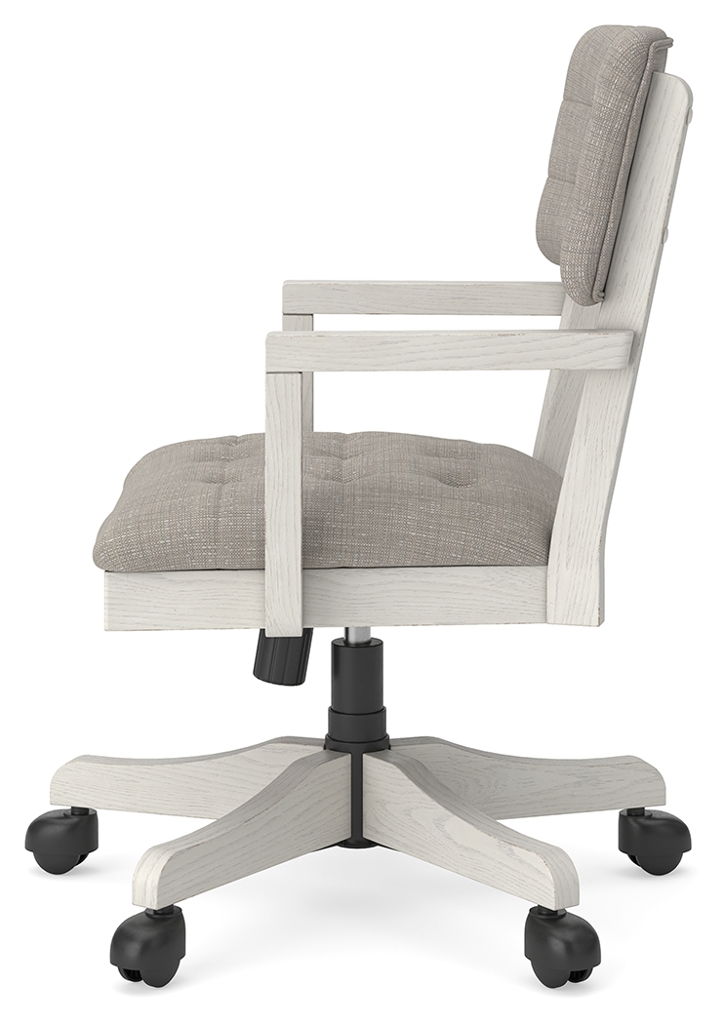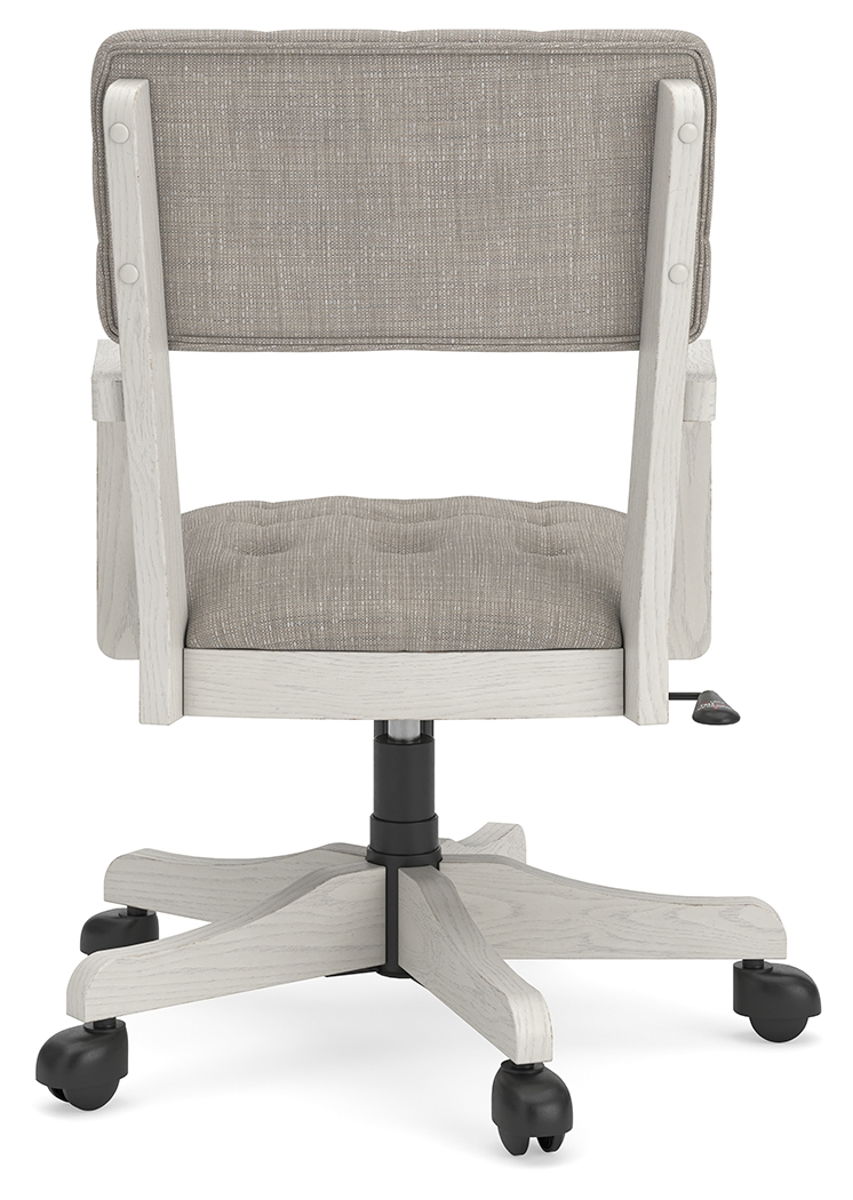 This home office desk chair is sure to impress when it’s time to study or work from home. With its antiqued white finish, cushioned seat and back covered in tufted light gray upholstery, modern farmhouse-style workstations have never been so fashionable. The adjustable seat allows you to find your sweet spot, while casters provide easy mobility. All that’s missing is you.