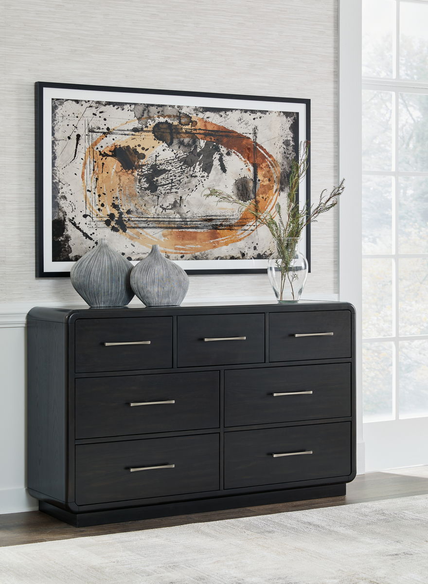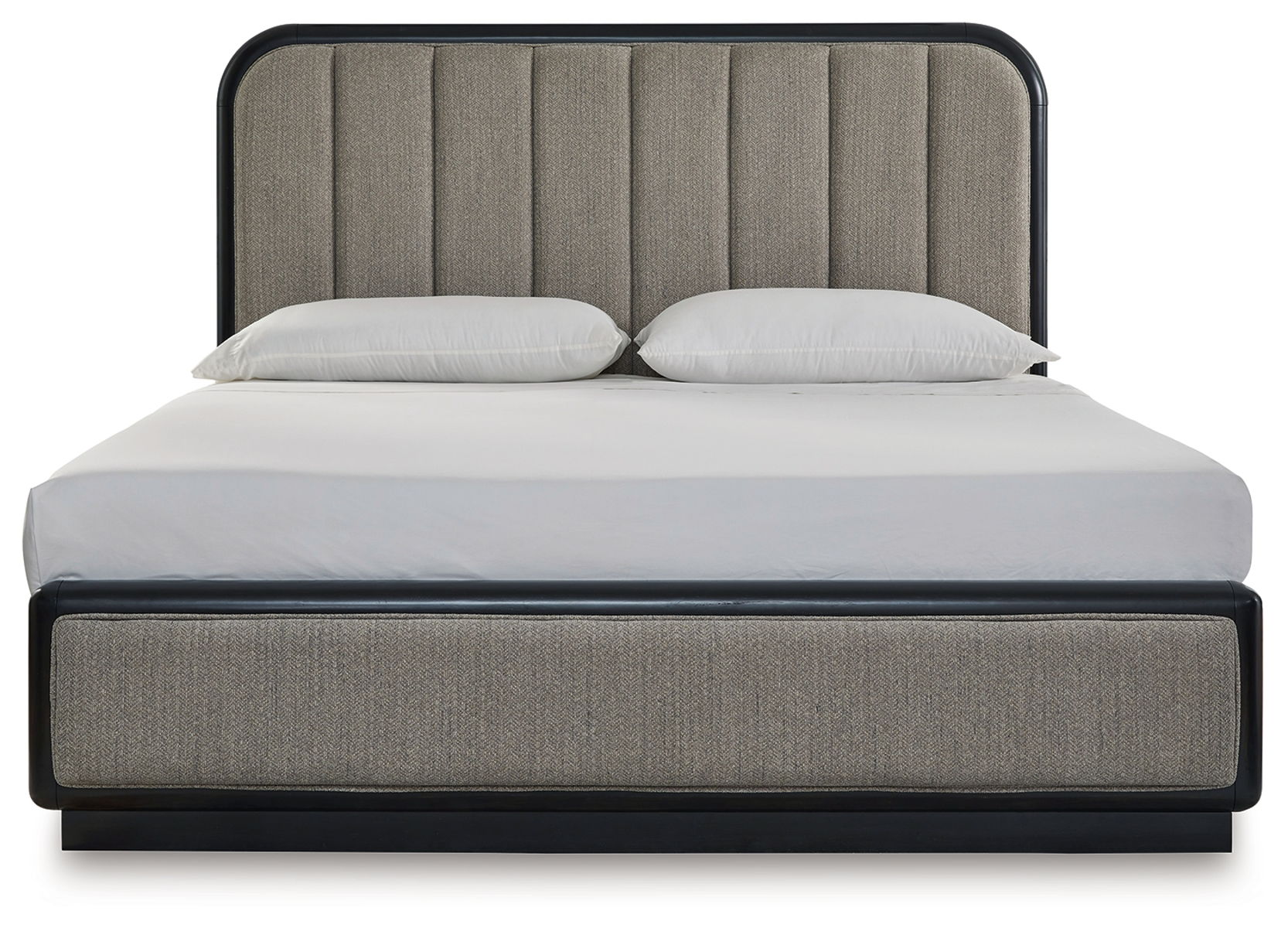 Inspired by art deco design, this softly shaped bedroom package makes a lasting impression in a simply stunning way. Contemporary lifestyle design. Made with hardwood solids and ash veneer. Rich layered finish on textured wood grain surface. Collection is inspired by Art Deco design elements such as softly shaped cases with waterfall edges and channeled upholstered headboard. Drawers feature French/English drawer construction, fully finished interiors and heavy duty ball bearing side glides. Upholstered bed features channeled headboard cushion and footboard in a herringbone textured fabric.