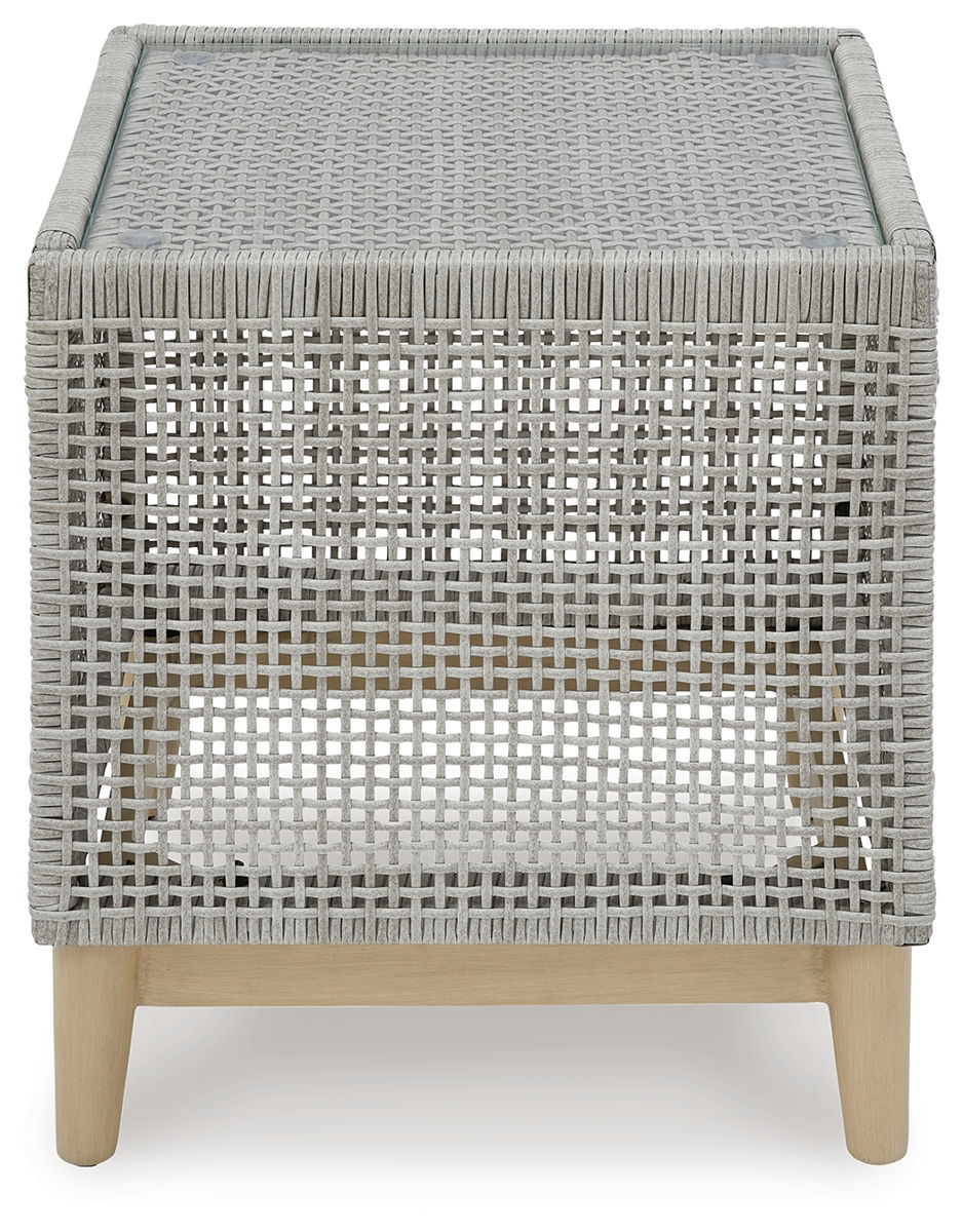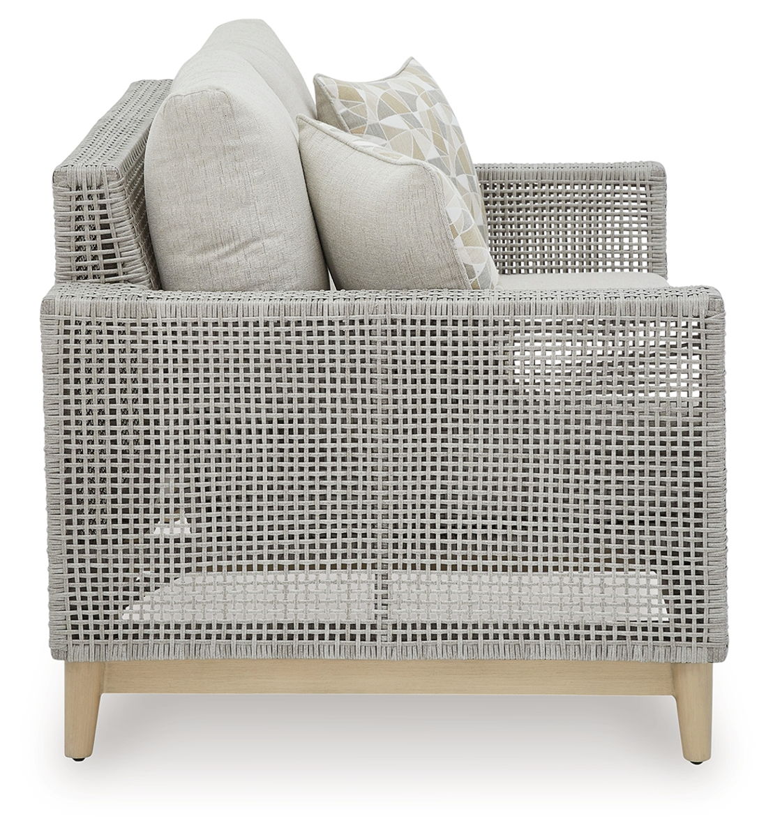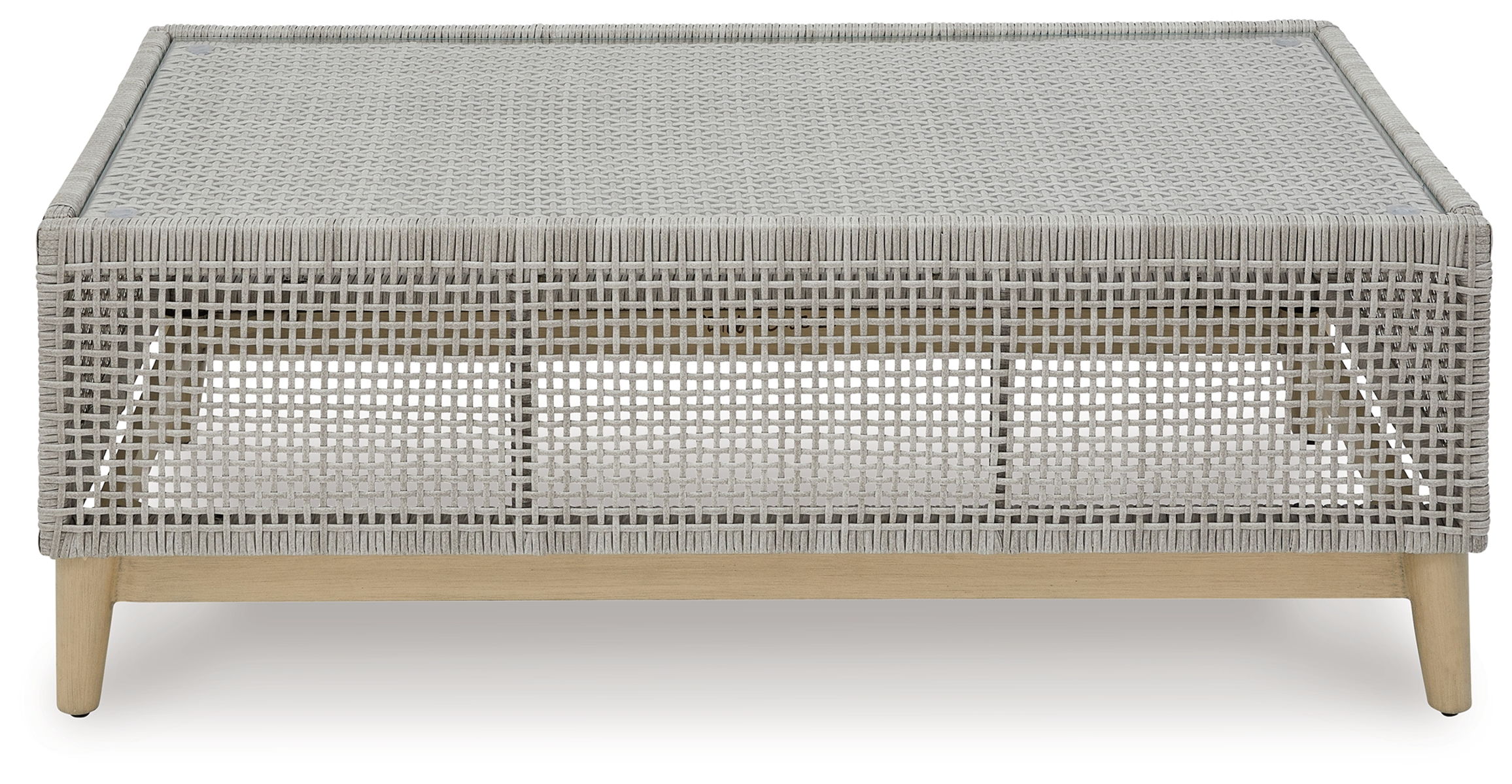 This set is a beautiful addition to any outdoor living space. Resin wicker on an aluminum frame. Wood look paint finish. Nuvella premium high performance fabric. Tempered glass top tables. Stainless steel hardware.