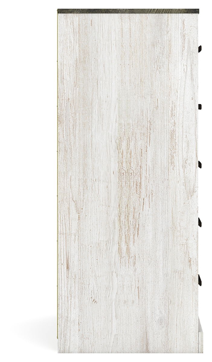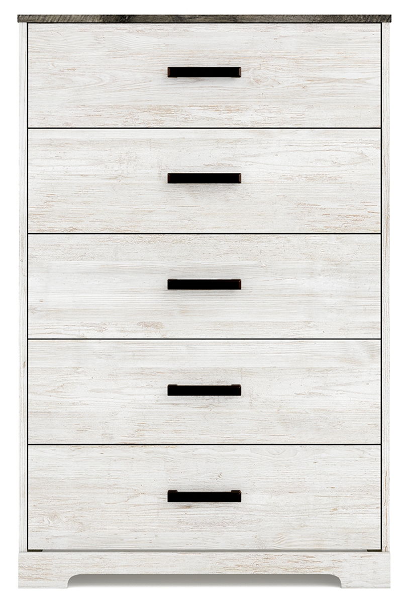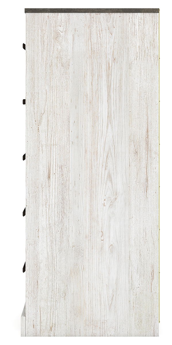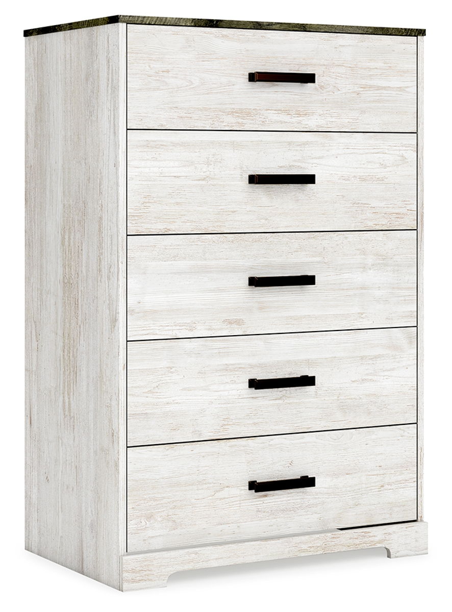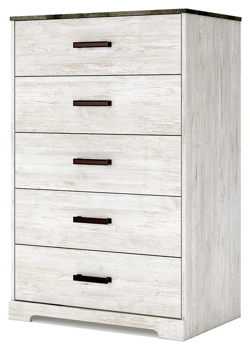 Give provincial a new meaning with the chic look of this chest of drawers. A two-tone finish keeps this piece light and fresh, while the warm pewter-tone hardware adds an industrial touch. The distressed body adds a delightfully homespun charm to your space.