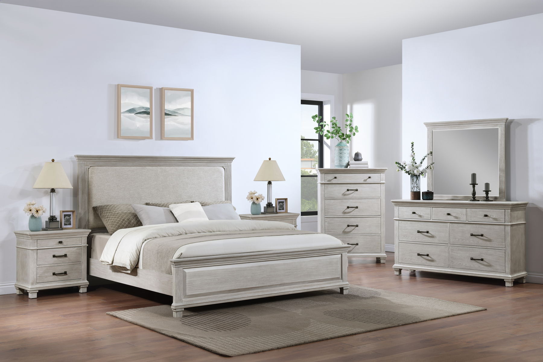 The Silver Sands Bedroom Set in Gray is the perfect choice for those seeking a combination of durability, style, and functionality. Each piece is crafted from solid pine, manufactured woods, and oak wood veneers, ensuring strong and stable construction. The transitional design features clean lines and a rustic wood finish, creating a calm and inviting atmosphere that complements any decor. The finish, hand-applied in multiple steps, highlights the natural grain and mineral patterns of the wood, offering a light, weathered look with a soft, slightly distressed appearance. The bed showcases an elegant design with a raised panel footboard and a plushly padded headboard, enhanced by dentil moldings and crown moldings for a sophisticated appeal.