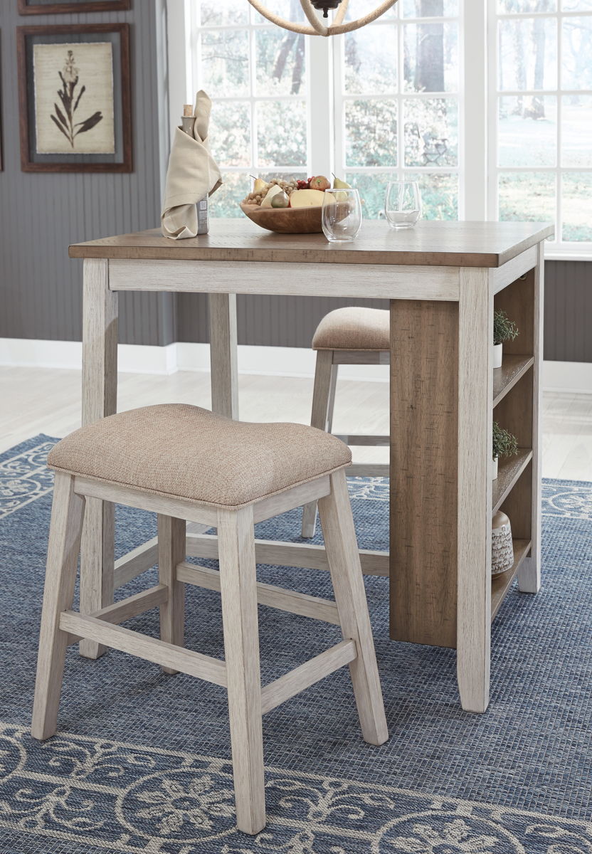 This clever counter height table and bar stool set invites you to raise the bar on small space living. An inspired choice for coastal chic or modern farmhouse settings, this clean-lined, simply striking set doubles the charm with brown tone plank effect tops, paired with grayish white bases with rub through effect for timeworn appeal. The table’s built-in open shelves make the most of every inch of space.