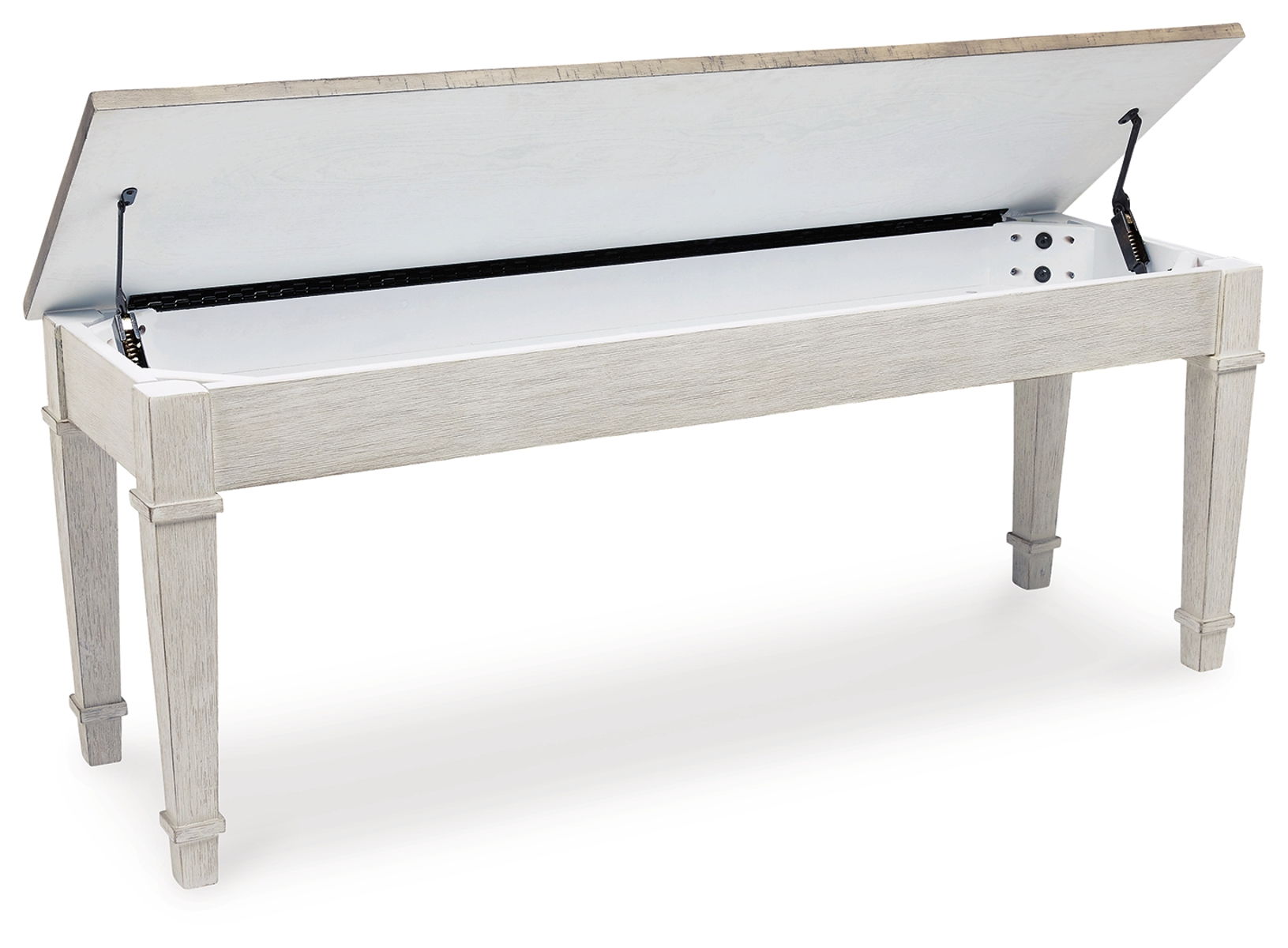 This bench invites you to strike a note for small space living. An inspired choice for coastal chic or modern farmhouse settings, this piano style bench with under seat storage sports a grayish white finish with rub through effect for timeworn appeal.