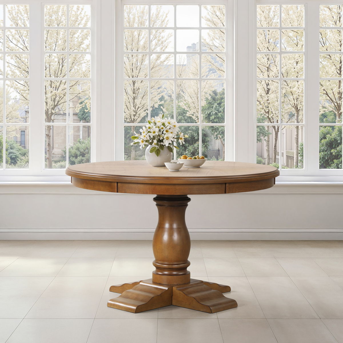 Meet the Sunset Dining Table, a statement maker in any home. Crafted with Rubberwood and Pine solids and Mindy veneers, this table is built to last. The clear Chestnut Brown finish highlights the natural beauty of the wood grain, adding an elegant touch to your dining area. With a 48-inch round top, this table provides seating for 4, inviting conversation and creating a wonderful setting for gatherings. Its transitional style features standout details, including extra wide shaped feet and a barrel-shaped pedestal base that supports the sunburst fancy face veneer tabletop trimmed with a solid wood edge. Upgrade your dining experience with the Sunset Dining Table, where durability meets style in every detail.