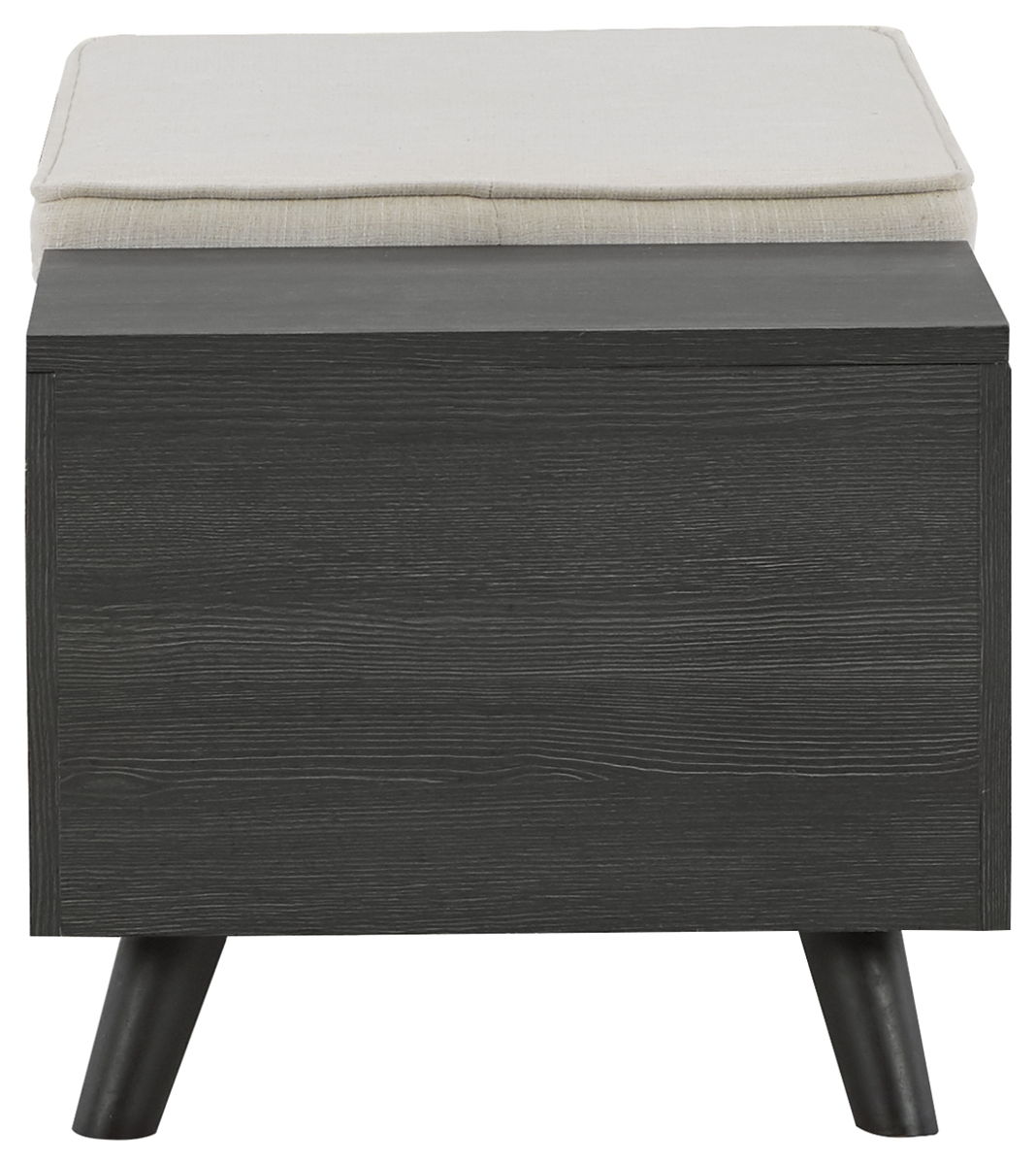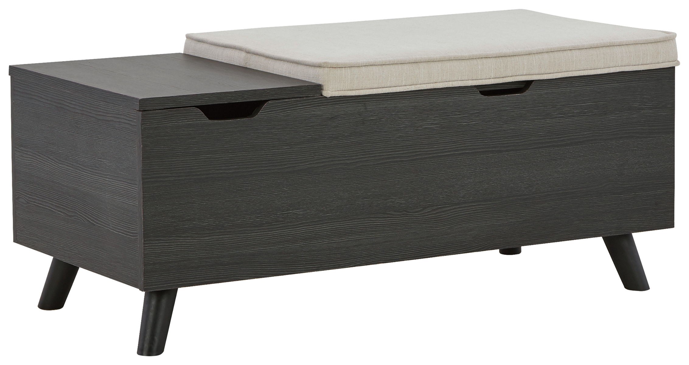 The clean profile of this small storage bench makes an entrance anywhere and everywhere you place it. A replicated blackened wood finish and tapered wood legs lend a fresh flair. Adding form and function, both tops are removable to expose hidden storage underneath. It’s a must-have piece for small spaces.